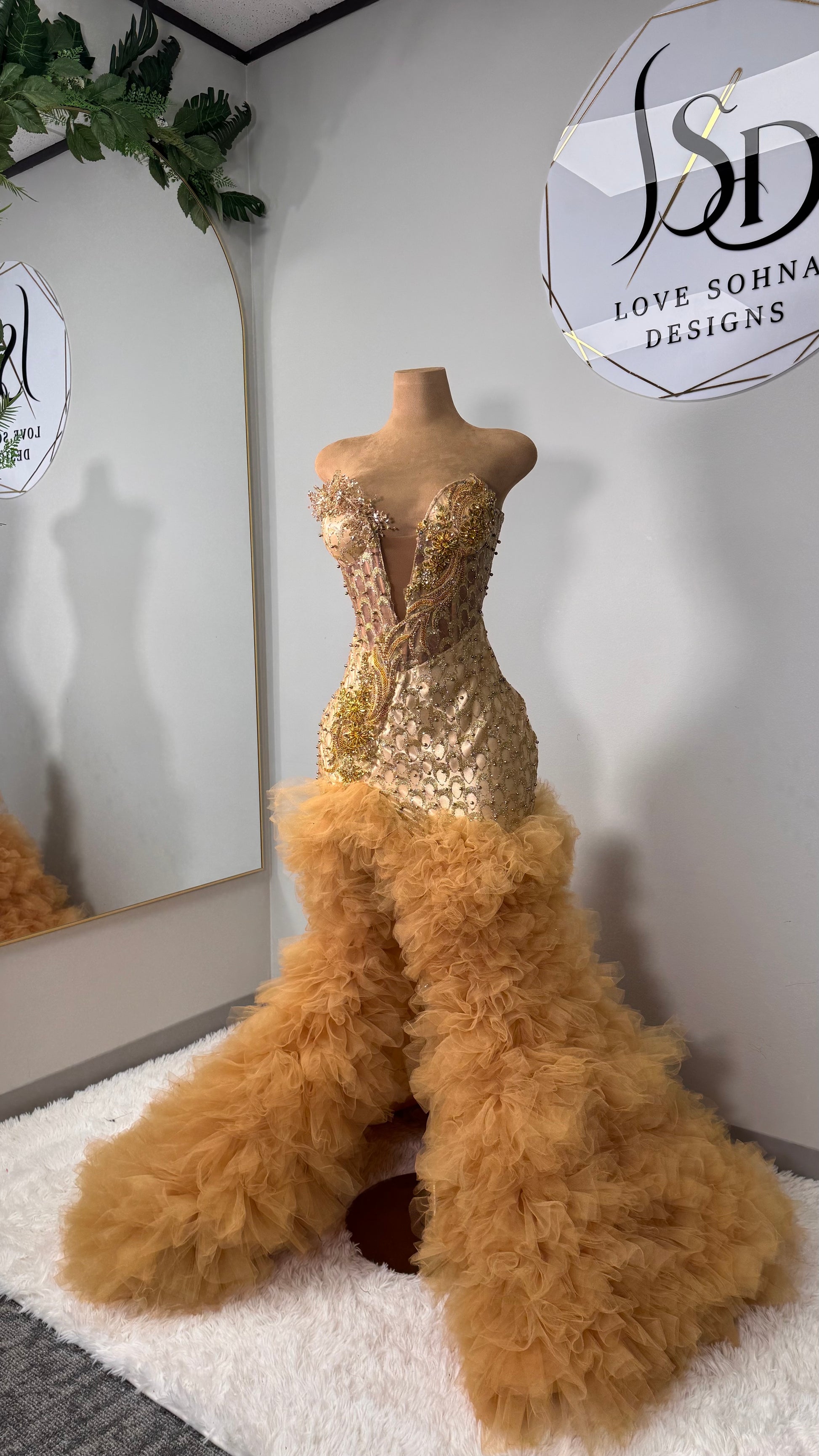 Custom Gold Bejeweled Dress with Feathers